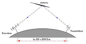 Sia il trasmettitore che il ricevitore devono essere sintonizzati sulla stessa frequenza che è compresa tra 30 e 100 MHz. Il ricevitore non può ricevere direttamente il segnale dal trasmettitore a causa della curvatura terrestre. Quando la meteora entra nell'atmosfera bruciando, si comporta come uno specchio e quindi riflette il segnale del trasmettitore verso il ricevitore. |