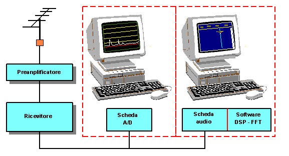 | Nell'acquisizione dei segnali riflessi dalle meteore (figura 3), oltre ad avere una buon sistema di ricezione, si utilizza un doppio sistema di analisi e memorizzazione. Il primo sistema fatto da un PC ed una scheda di conversione Analogico/Digitale ed un software di visualizzazione e memorizzazione del segnale ricevuto che da la possibilità di avere una visione complessiva della quantità di meteore che interessano la zona di acquisizione. Il secondo PC più specializzato, è corredato da una scheda audio ed un software particolare di elaborazione veloce del segnale (DSP/FFT) ed un supporto di memorizzazione ad alta capacità. |